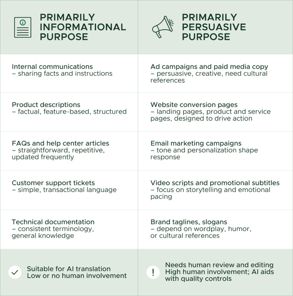 To figure out your translation goals for specific content types, it’s helpful to ask a few key questions:
